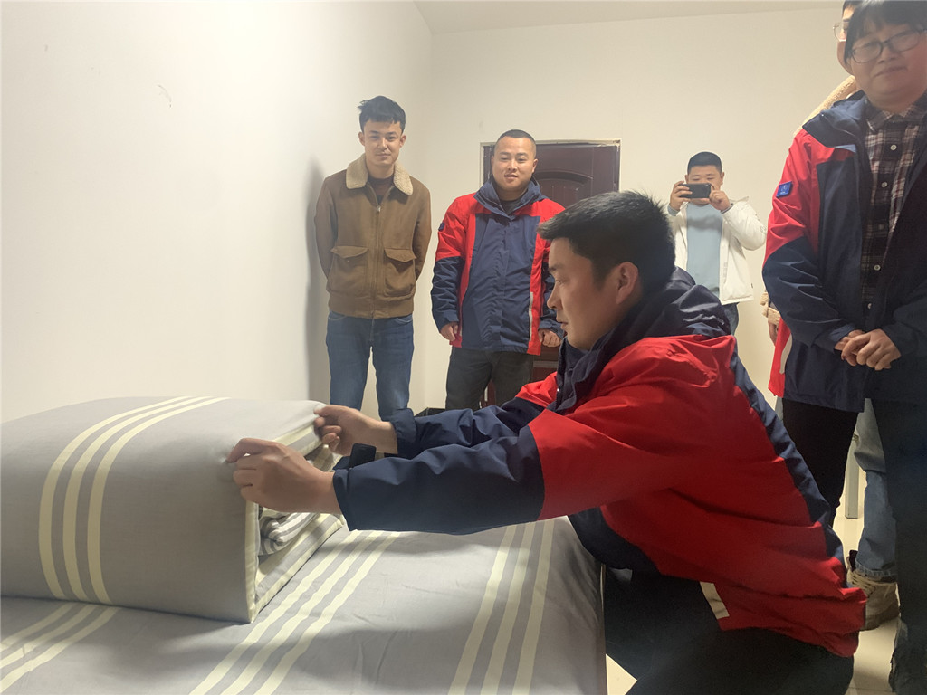 第三分公司為進(jìn)一步增強(qiáng)全體職工文明衛(wèi)生意識(shí),樹(shù)立優(yōu)良的生活作風(fēng)、養(yǎng)成良好的生活習(xí)慣,于3月16日組織職工進(jìn)行內(nèi)務(wù)整理活動(dòng);顒(dòng)中退伍老兵李晟同志親自上陣,向職工演示了軍人標(biāo)準(zhǔn)的整理內(nèi)務(wù)流程。“被子要疊得有棱有角”、“鞋要放整齊,成直線(xiàn)擺放”,“地面要整潔,決不能留衛(wèi)生死角”……退伍老兵李晟邊操作邊講解,熟練而精準(zhǔn)地借助 “壓、折、擠、掏”等基本動(dòng)作完成了從“棉被”到“豆腐塊”的華麗轉(zhuǎn)變。