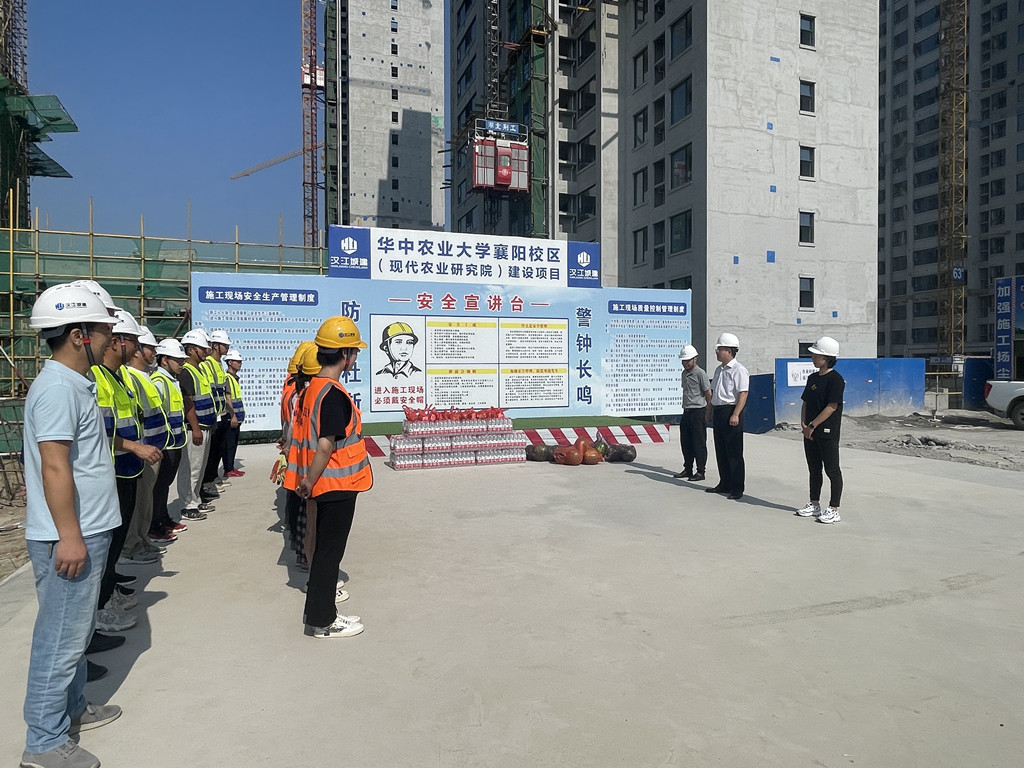 為切實(shí)做好夏季防暑降溫工作,保障施工人員的身體健康,確保疫情防控和安全生產(chǎn)有序進(jìn)行,6月16日上午,漢江國投集團(tuán)總經(jīng)理助理胡鈞一行頂著酷暑來到華中農(nóng)業(yè)大學(xué)襄陽校區(qū)建設(shè)項(xiàng)目一線施工現(xiàn)場,開展“情系一線送清涼 濃濃關(guān)愛暖匠心”夏季“送清涼”活動(dòng),為辛勤勞動(dòng)在一線崗位上的工人送去了絲絲清涼;智投公司負(fù)責(zé)人、漢江城建華農(nóng)項(xiàng)目相關(guān)負(fù)責(zé)人陪同。