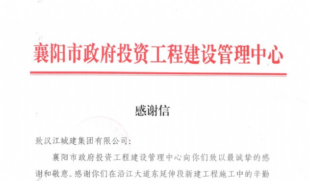 近日,襄陽市政府投資工程建設(shè)管理中心作為沿江大道東延伸段新建工程業(yè)主單位送來感謝信,對我司在沿江大道東延伸段新建工程施工
