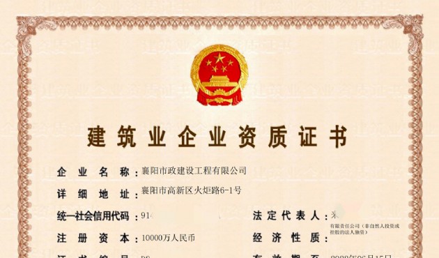 6月19日,經(jīng)湖北省住房和城鄉(xiāng)建設(shè)廳核準(zhǔn),市政公司申報(bào)的建筑工程施工總承包貳級、市政公用工程施工總承包貳級、隧道工程專業(yè)承包