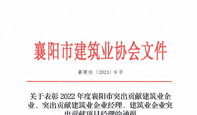 喜訊:漢江城建榮獲“2022年度襄陽市突出貢獻(xiàn)建筑業(yè)企業(yè)”稱號(hào)