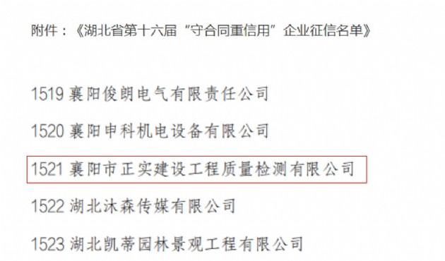 近日,襄陽(yáng)市正實(shí)建設(shè)工程質(zhì)量檢測(cè)公司順利通過(guò)湖北省市場(chǎng)監(jiān)督管理局評(píng)審,榮獲“湖北省守合同重信用企業(yè)”稱號(hào)。&ldq