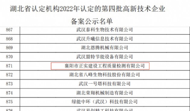 漢江城建正實(shí)檢測(cè)公司獲評(píng)“國(guó)家高新技術(shù)企業(yè)”