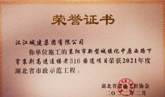 近日,2021年湖北省市政示范工程評選結(jié)果公布,由漢江城建承建的襄陽市勝利街景觀大道工程和襄陽市新型城鎮(zhèn)化中原西路下穿襄荊高