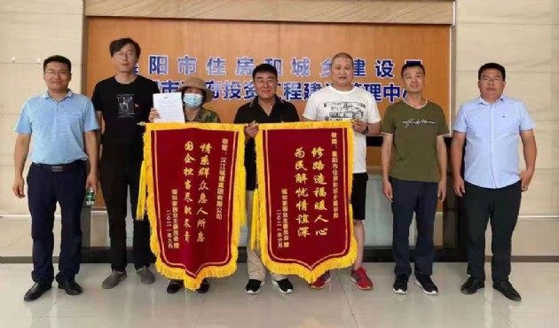 6月28日,丹江路福如家園業(yè)主委員會會員來到襄陽市住房和城鄉(xiāng)建設(shè)局,將一面金光閃閃的錦旗,交到漢江城建承建的丹江路綜合整治工