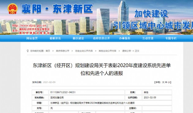 2月9日,東津新區(qū)管委會官網(wǎng)發(fā)布《東津新區(qū)規(guī)劃建設局關于表彰2020年度建設系統(tǒng)先進單位和先進個人的通報》。漢江城建集團有限公