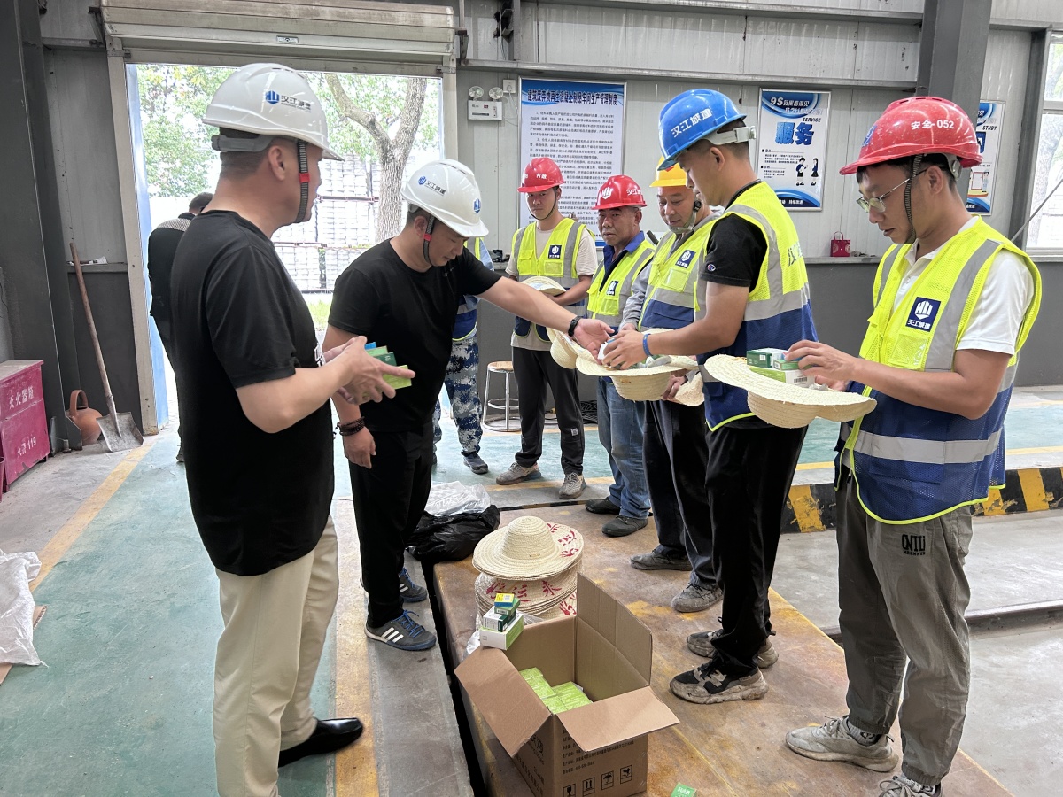 在新材料公司制磚車間內(nèi),公司領導班子成員為一線生產(chǎn)工人送上防暑降溫慰問品,發(fā)放宣傳頁,普及防暑知識和職業(yè)病預防知識,并與他們親切交談,了解大家的工作及生活情況,對他們堅守工作崗位表示感謝和致以敬意,叮囑大家要合理安排工作,注重崗位操作安全,同時要注意防暑降溫,保重身體,增強自我安全防范意識,確保各項工作安全、有序推進。